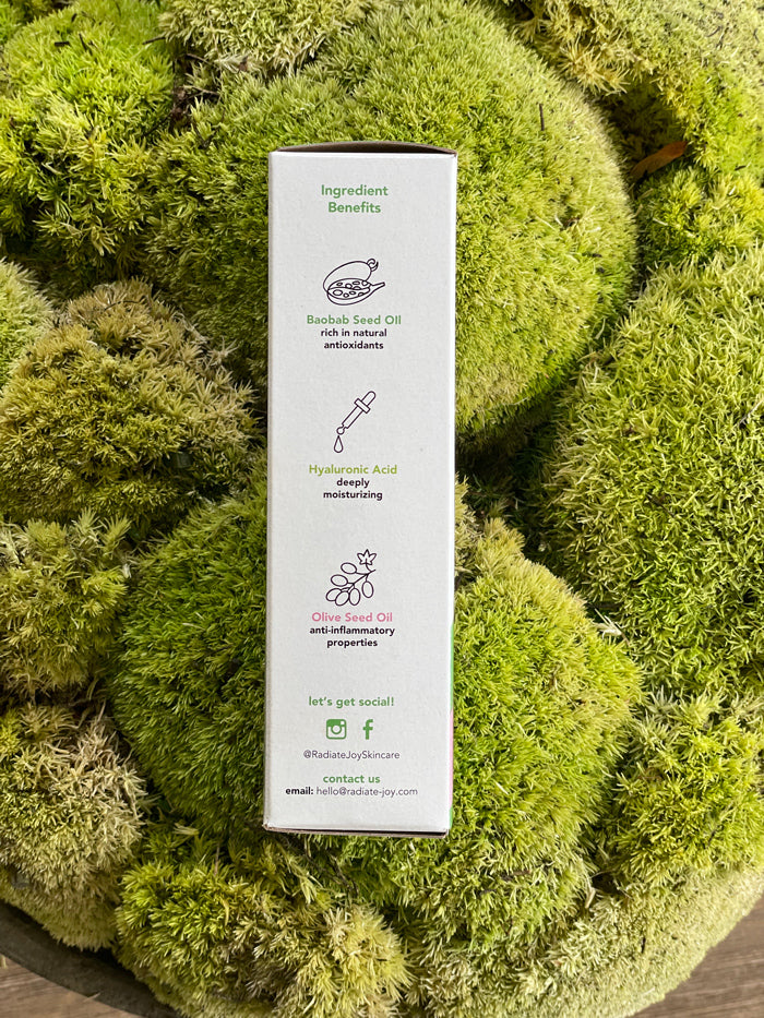 An all-in-one serum containing antioxidant rich Baobab Seed Oil and Hyaluronic Acid firms, hydrates & brightens, leaving skin radiant and youthful. Twice daily after cleansing apply 1-2 pumps to face and neck. Follow with moisturizer.